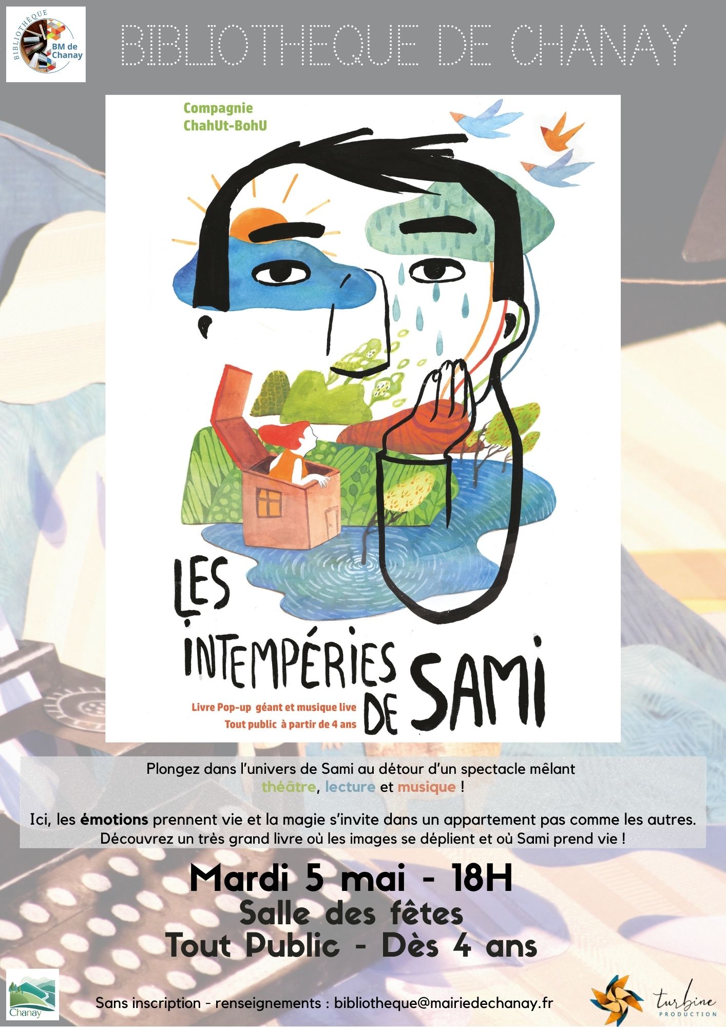 Sur scène, un très grand livre pop up s’ouvre. Les images s’animent, se déplient et se déploient. Sami et son appartement prennent vie ! Lorsque les émotions s’échappent de Sami, elles envahissent les illustrations, se propagent dans l’appartement jusqu’à déborder du livre et envahir la scène.